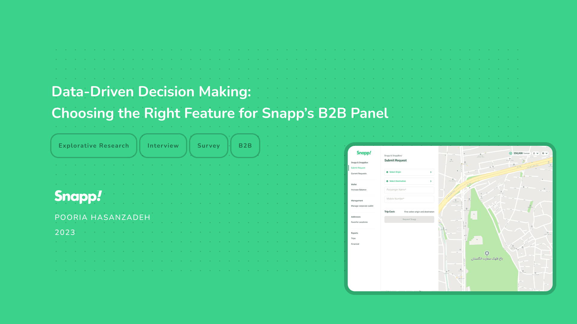 Snapp is the largest ride-hailing service in Iran with both B2B & B2C sides. The B2B corporate ride-booking panel is used by small to big companies in Iran, with 5K daily rides.