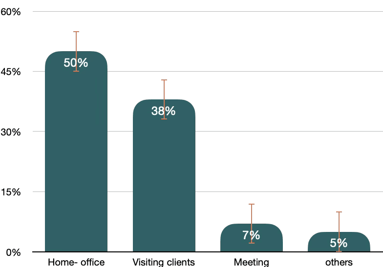 50% of all company rides are for taking rides to the office and home. During working hours, most rides (38% of all) come from commercial marketing teams that have to go to visit their clients.
