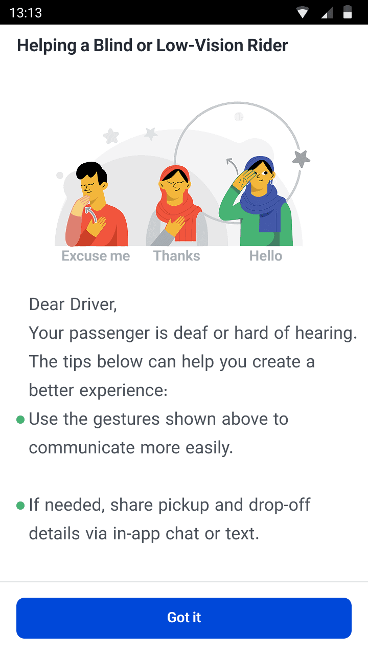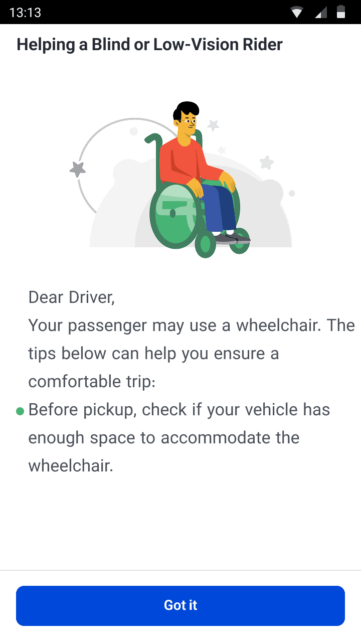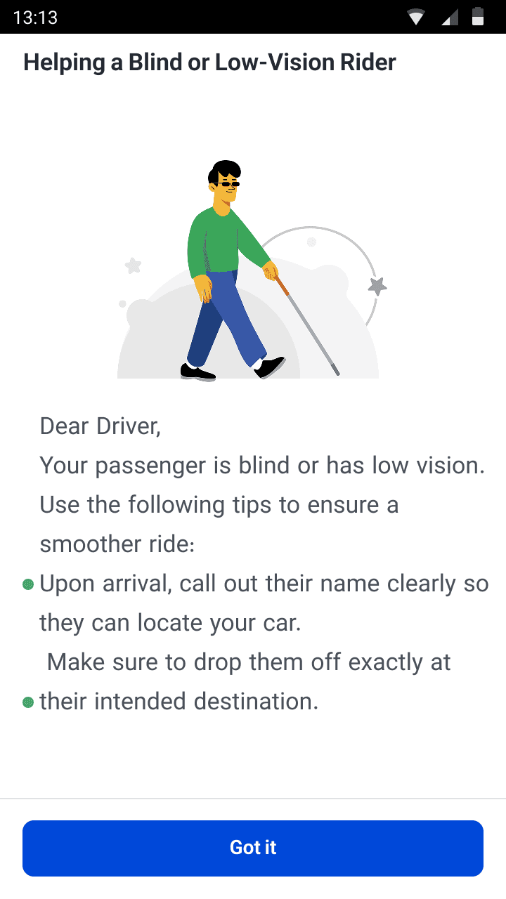 Introduced a driver onboarding screen with guidelines on communicating with passengers with different accessibility needs.